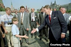На фото, гуляющем по интернету, двадцатилетней давности прогулка президента Рейгана по Красной площади во время визита в Москву в мае 1988-го.