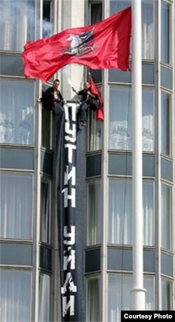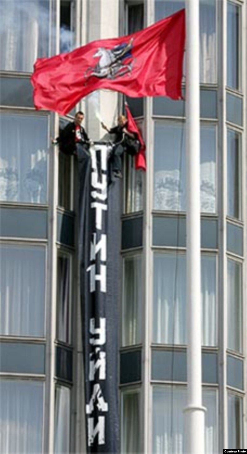 - Мы сняли номер и вывесили на фасаде гостиницы "Россия" вертикальный 11-метровый плакат с надписью "Путин, уйди сам". Мы провисели два с половиной часа, после этого были вызваны сотрудники МЧС, которые сняли нас со стены. Сотрудники различных ведомств сопроводили нас в отделение милиции, где сначала было заведено дело по административной статье, а потом, уже в процессе отбывания наказания по административной статье, на нас было заведено уголовное дело, которое закончилось моим отъездом.