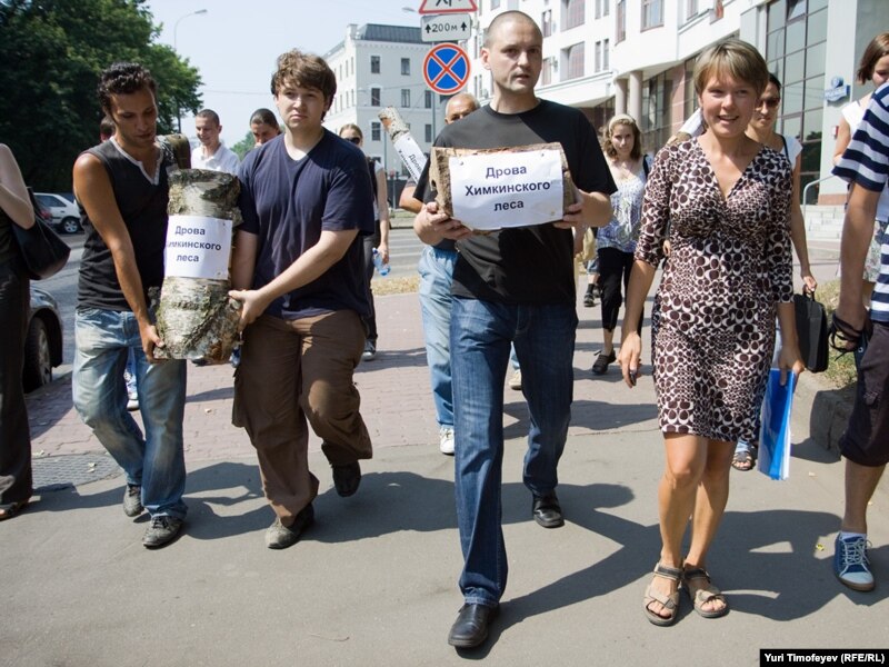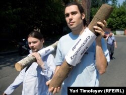 Защитники Химкинского леса и представители "Левого фронта" провели акцию у Белого дома. Евгения Чирикова и ее товарищи привезли с собой уничтоженные вырубщиками деревья - к бревнам прикреплены листки с надписями "дрова из Химкинского леса". Активисты собирали подписи под обращением к правительству России с требованием прекратить вырубку. Акция была пресечена милицией.