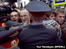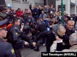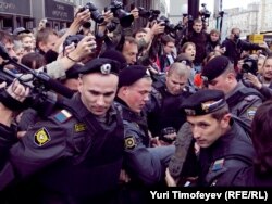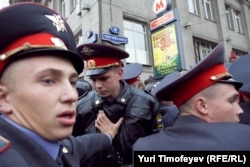Главный редактор радиостанции "Эхо Москвы" Алексей Венедиктов объясняет милиционеру, что он просто стоит