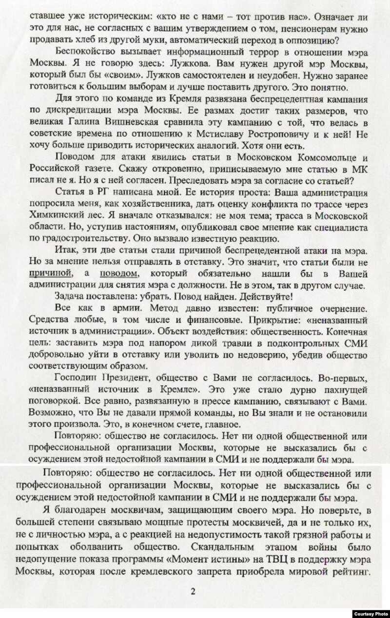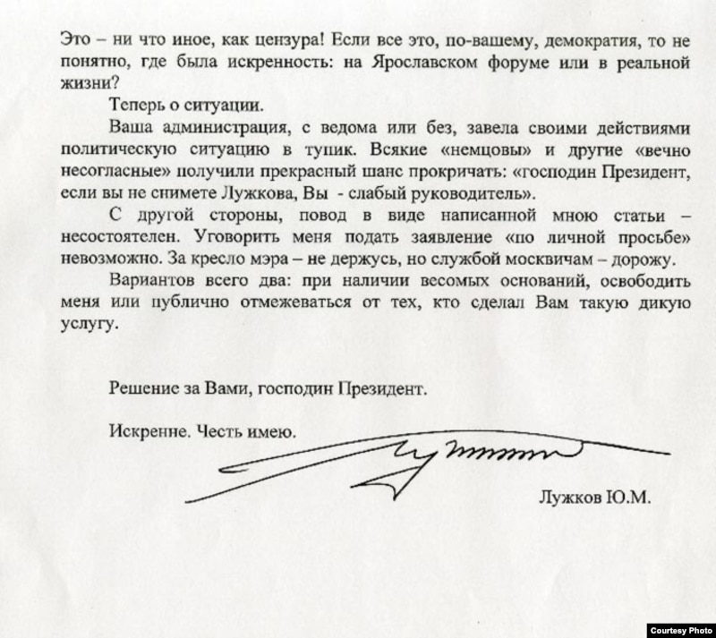 Журнал The New Times опубликовал письмо, которое накануне отставки мэр Москвы якобы направил президенту Дмитрию Медведеву. Сайт журнала был некоторое время недоступен - то ли не выдержал притока посетителей, то ли у этого сбоя есть иные причины. В этой ситуации сайт Радио Свобода считает возможным дать то же факсимиле, размещенное коллегами.