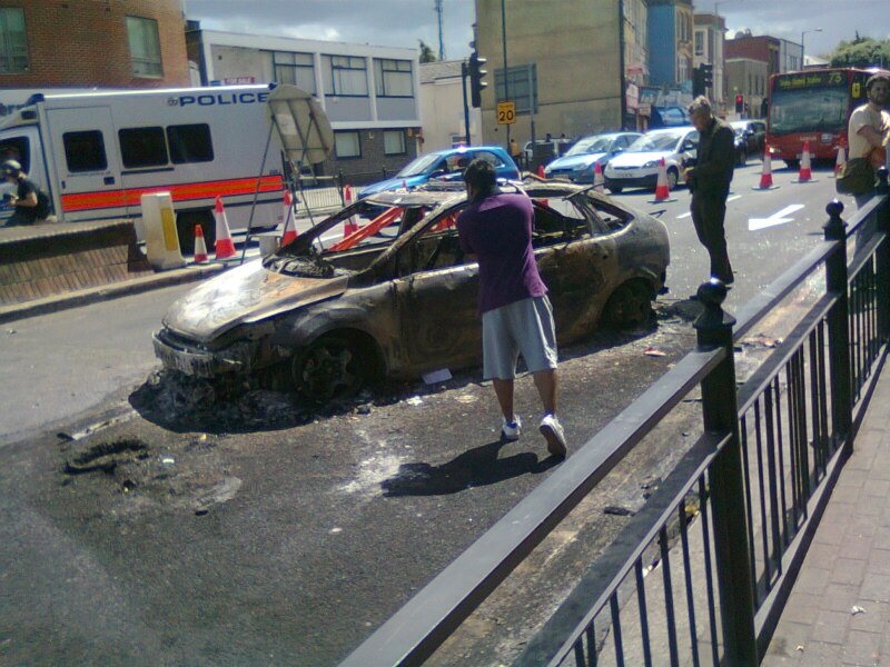 На следующий день главная улица Тоттенхэма была по-прежнему перекрыта, на границе оцепления посередине дороги осталась машина, в которой лишь с трудом можно было опознать полицейскую, настолько она обгорела. Собравшаяся вокруг толпа обсуждала происшедшее.