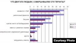 На вопрос, что двигало людьми, совершившими теракты 11 сентября, 39% россиян отвечают "ненависть к США", 31% респондентов предполагают, что это был религиозный фанатизм, а 20% говорят – "безумие".