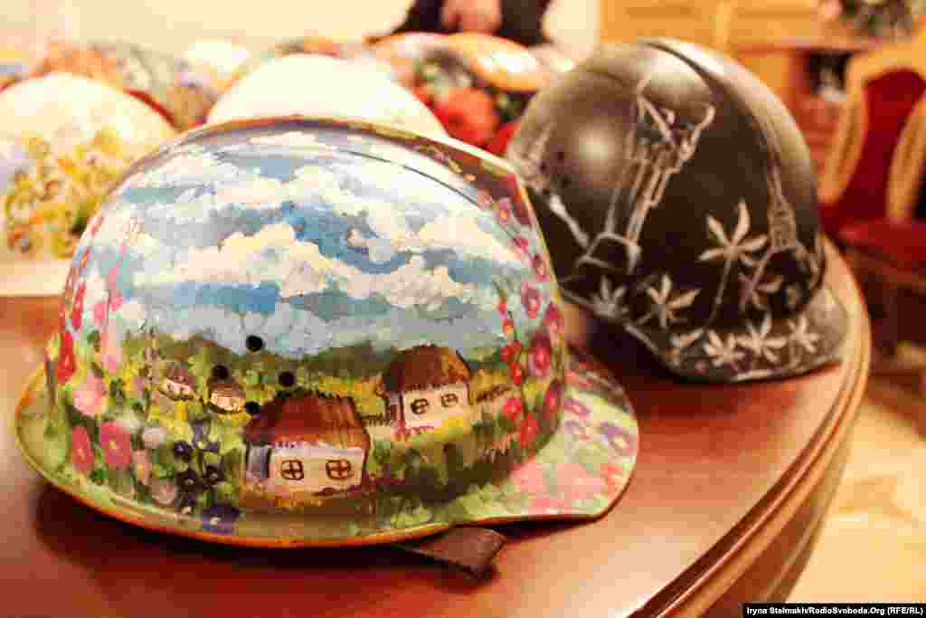 Украинские художники решили поддержать Евромайдан. На выставке в Украинском доме - более 100 касок, с помощью которых протестующие пытались защитить себя от полиции. (Фото Ирины Стельмах, Украинская служба Радио Свобода)