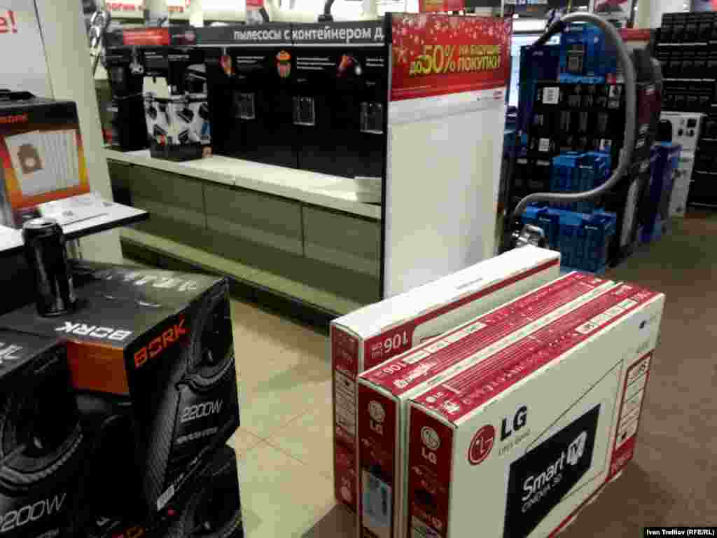 В России наблюдается ажиотажный спрос на отдельные виды товаров, в первую очередь, на бытовую технику и электронику. Отчасти такие рекордные продажи связаны с наступающим праздником, но основная причина – в желании людей вложить свои обесценивающиеся рубли перед неминуемым повышением цен. В результате этой массовой скупки товаров в некоторых магазинах Москвы, например, уже заметно их полное или частичное отсутствие. Фотографии сделаны смартфоном