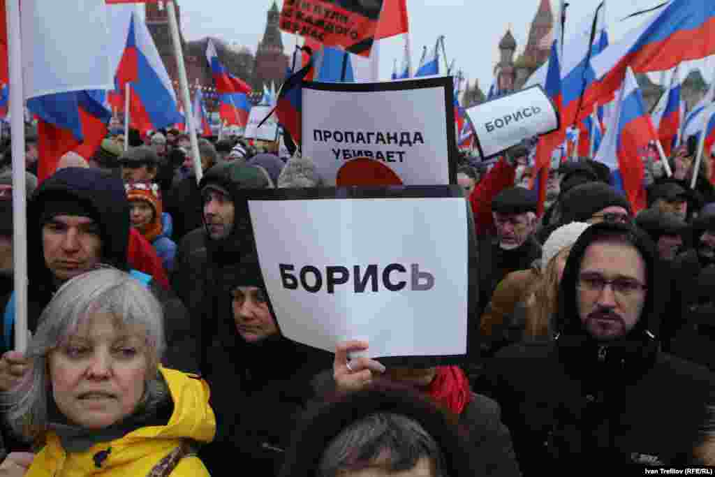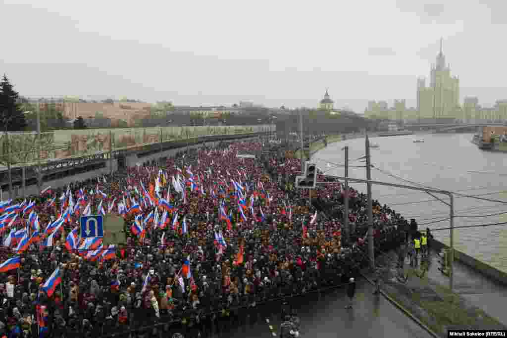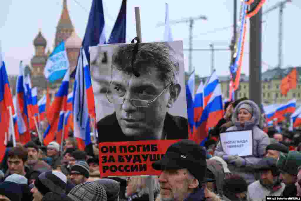 В Москве прошел многотысячный марш памяти убитого лидера демократической оппозиции Бориса Немцова. Участники шествия несли плакаты с его изображением. Немцов был застрелен в ночь на субботу в центре Москвы.