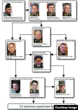 Цепочка, по которой передавалось решение об использовании российских "Буков" в войне на Украине – инфографика Bellingcat: