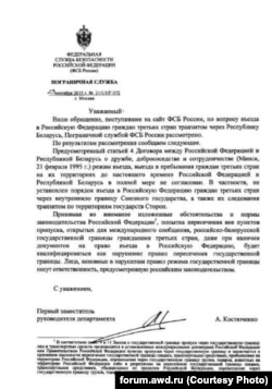 В другом ответе Погранслужбы ФСБ, опубликованном на том же форуме и датированном осенью 2015 года, ведомство признает, что вопросы пересечения российско-белорусской границы гражданами третьих стран "в полной мере не согласованы":