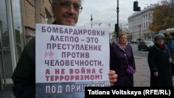 Около десяти активистов петербургского отделения движения "Солидарность" и других демократических организаций выступили с одиночными пикетами на Невском проспекте, протестуя против бомбардировок города Алеппо в Сирии. По мнению участников акции, действия российских военных не являются борьбой с террористами и приводят к неоправданным жертвам среди мирного населения.