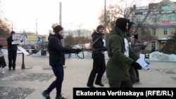 Участники акции разыграли перформанс: "царь-начальник" в короне водил на поводках "подчиненных", у которых на груди было написано "ничего не слышу". Так гражданские активисты представляют себе работу нового состава Общественной наблюдательной комиссии Иркутской области. Они убеждены, что новоизбранные защитники прав заключенных не будут активно исполнять свои обязанности. Мероприятие они провели в рамках "Стратегии-18" — проекта, цель которого — привлечь внимание общественности к произволу правоохранительных органов. Протестное мероприятие было согласовано с мэрией Иркутска и состоялось, несмотря на холодную погоду.