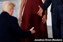 Дональд Трамп, одержавший неожиданную победу на выборах президента США в ноябре прошлого года, 20 января 2017-го вступал в должность. На фотографии он запечатлен, когда перед инаугурацией прибыл в Белый дом, где его встречали уходящий президент Барак Обама с супругой Мишель.