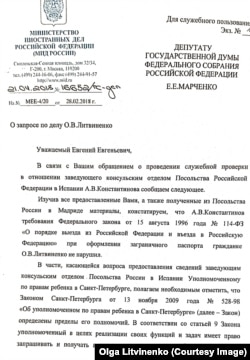 В дальнейшем я узнала, что депутат Госдумы РФ Е. Марченко, видимо, до сих пор переживающий мой отказ стать его невестой, сделал депутатский запрос в МИД РФ с просьбой проинформировать его, какие меры наказательного характера были приняты в отношении сотрудников посольства РФ в Испании, которые выдали мне паспорт. В ответ на этот нелепый запрос был получен ответ из МИД РФ, что никаких нарушений при выдаче мне нового паспорта сотрудниками посольства допущено не было, личность моя была идентифицирована в полном соответствии с установленным порядком, документы проверены, и паспорт был выдан на законных основаниях. Для Вашего сведения копию запроса депутата Марченко, который, видимо, никаких более важных государственных дел в вашей Государственной думе для себя найти не может, и копию ответа этому самому депутату из МИД РФ прилагаю.