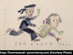 "После выступления вице-адмирала Мухаметшина я нарисовал такого вот моряка, который преследует Иммануила Канта, потому что он не вписывается в его систему ценностей. Его никто не читает, он никого не устраивает, Кант никому не нужен. Значит, его надо прогнать".
