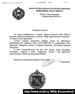 Радио Свобода удалось обнаружить скан письма, в котором командование и состав в/ч 40056-Н НИЦ поздравляют "Курчатовский институт" (занимается в том числе исследовательскими работами по атомной тематике) с 75-летием со дня основания – юбилей отмечался в апреле 2018 года. Судя по адресу на письме, в этот момент в/ч 40056 была дислоцирована в Санкт-Петербурге. Примечательно, что в нижней части письма расположена нынешняя эмблема ГУГИ, а вот знак с крабом в верхнем левом углу в деталях различить сложно, возможно, он относится именно к воинской части в составе управления.