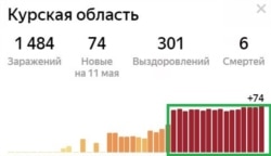 Еще один график (как и предыдущий, он построен Яндексом на основании официальных данных российского правительства) показывает ежедневный прирост новых инфицированных коронавирусом в Курской области. Этот регион не раз назывался российскими экспертами как место частого проявления "электоральных аномалий", когда результаты выборов вызывали подозрения в их искусственной подгонке. С 15 по 25 апреля число ежедневных новых подтвержденных случаев заражения коронавирусом колебалось здесь от 22 до 44 человек в день. 26 апреля был зафиксирован рост заразившихся в полтора раза – 67 человек. С тех пор каждый день это число остается стабильным, не опускаясь ниже 65 и не увеличиваясь больше 74.