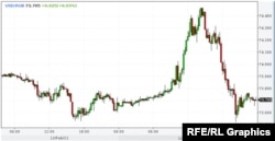 И еще, раз уж речь зашла об экспортерах. Вернемся к ситуации с "неосторожным" высказыванием главы Министерства иностранных дел Сергея Лаврова о готовности к разрыву отношений с Евросоюзом. Эту фразу буквально клещами вытащил из Лаврова Владимир Соловьев, который брал у министра интервью. И посмотрим на реакцию валютного рынка на графике курса доллара в этот день.