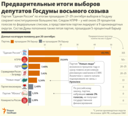 "Единая Россия", по предварительным данным, получает в Государственной думе порядка 120 мандатов по федеральному списку и 195 - по одномандатным округам, что в совокупности обеспечит партии конституционное большинство в нижней палате, сообщает "Интерфакс".