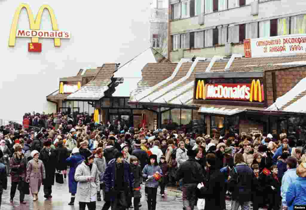 На фоне напряжения в отношениях с Западом в России проверяют рестораны Макдоналдс, работа трех из них уже приостановлена. А почти 25 лет назад именно эта сеть стала символом окончания "холодной войны", и москвичи и гости столицы стояли в очереди за гамбургерами