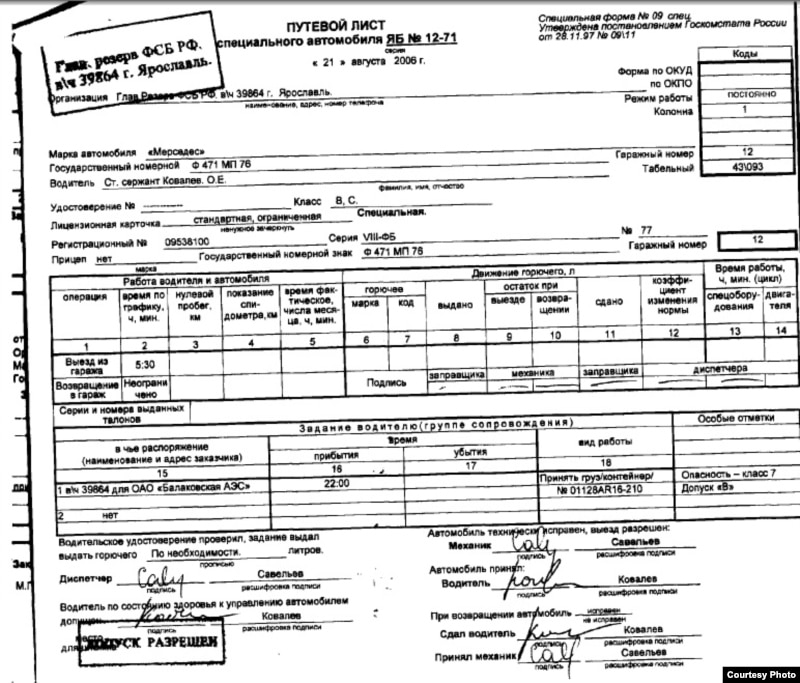 – Мы очень благодарны отважным людям, рискнувших жизнью и скопировавших такие документы. Станция принадлежит Росатому, то есть гражданской организации. В Москве этот контейнер был сдан под расписку представителям ФСБ, а именно - сотрудникам Научно-исследовательского центра ФСБ, так называемого ЦНИИ-2 ФСБ. Если эти документы - правда, то они показывают, что примерно за два месяца до того, как полоний впервые был обнаружен в Лондоне, контейнер с полонием был передан из гражданской системы Росатома в систему ФСБ. А перевозку этого контейнера осуществляла специальная воинская часть, которая базируется в Ярославле. Документы представляют собой путевой лист для водителя этой воинской части, некоего старшего сержанта, и товарную накладную, из которой по кодировке контейнера следует: там находится полоний, произведенный в Сарове, бывшем ядерном центре Арзамас-16. Примерно и все. Если это все правда, то это очень сильно добавляет аргументов к версии, что ФСБ стоит за отравлением Литвиненко, что это было государственное преступление. Это был не какой-то украденный полоний, а полоний, вполне официально переданный. Совпадение маловероятно, на наш взгляд. Полоний - достаточно редкая вещь. И то, что он поступил в ФСБ буквально за два месяца до убийства, указывает на это. Это, конечно, косвенная, не прямая улика. В этих документах указаны фамилии, по крайней мере 8 человек – шофера, офицера охраны, двух достаточно высоких сотрудников на самой Балаковской АЭС. К тому же, все равно это копии, не подлинники. А подлинники где-то там лежат.